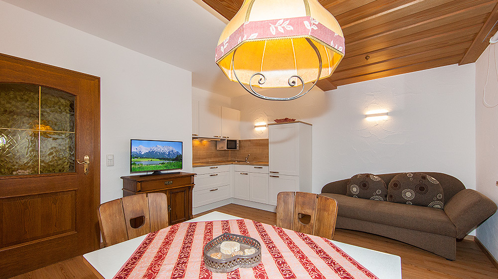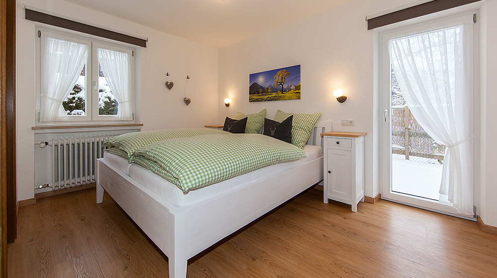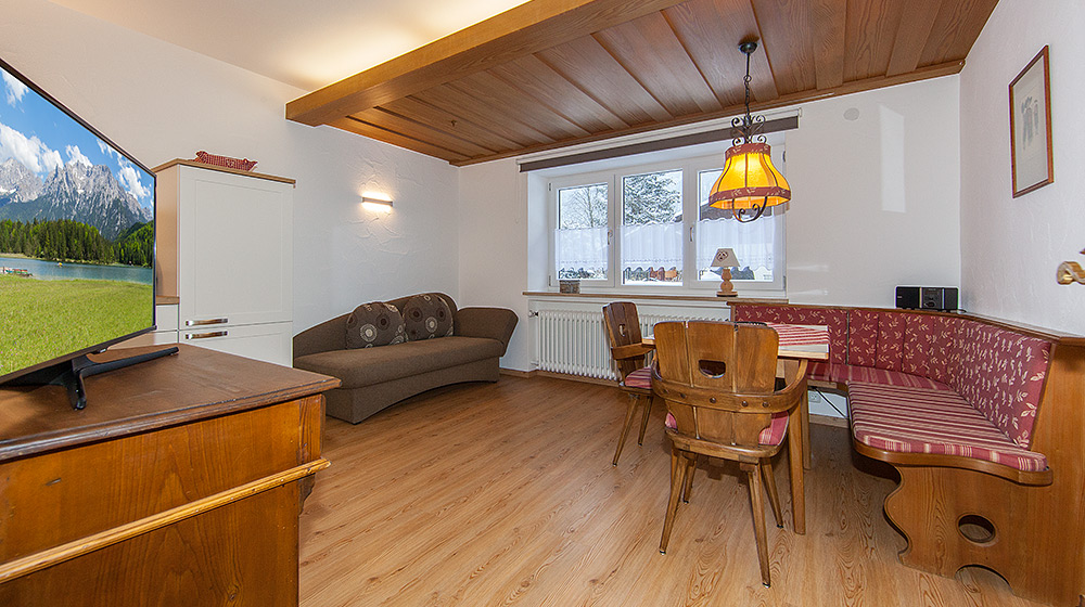 Die hochwertig ausgestattete, im Jahr 2015 renovierte Ferienwohnung Nr. 2 im Erdgeschoss hat eine große Wohnküche und ein Schlafzimmer sowie ein Badezimmer. Beim Frühstück können Sie durch das große Panoramafenster den Sonnenaufgang über dem Karwendelgebirge beobachten. Im Garten steht ein Sitzbereich zur Verfügung, Gartenmöbel stehen hier für Sie bereit.