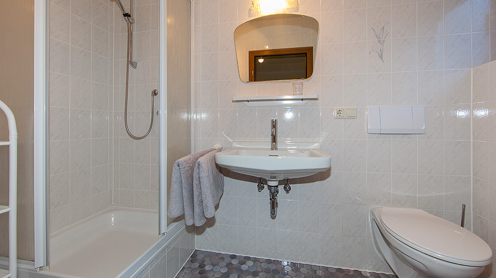 Das Badezimmer ist mit einer Duschkabine ausgestattet, ein Haartrockner ist vorhanden.