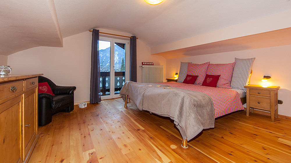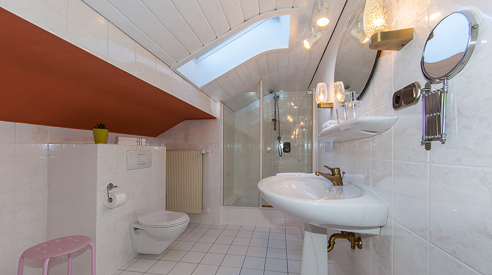 Im Dachgeschoss unseres Hauses bieten wir unseren Gästen ein Doppelzimmer mit separatem Bad und Balkon an.